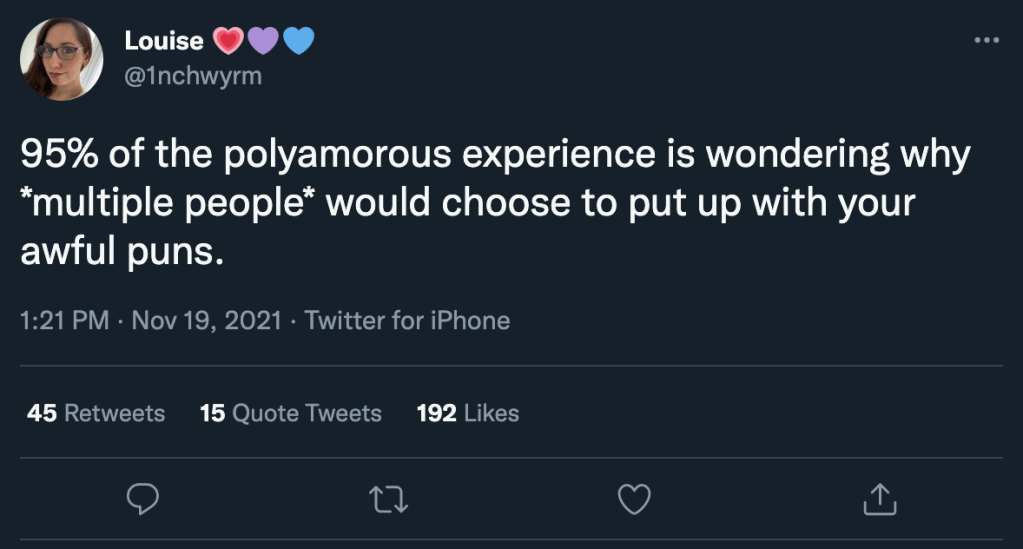 One of my partners sent me this tweet recently, and I did get a good laugh out of it, but it also made me think about something: as a polyamorous person with multiple partners, I sometimes forget who I’ve told what to. Not major stuff (usually); just minor things.