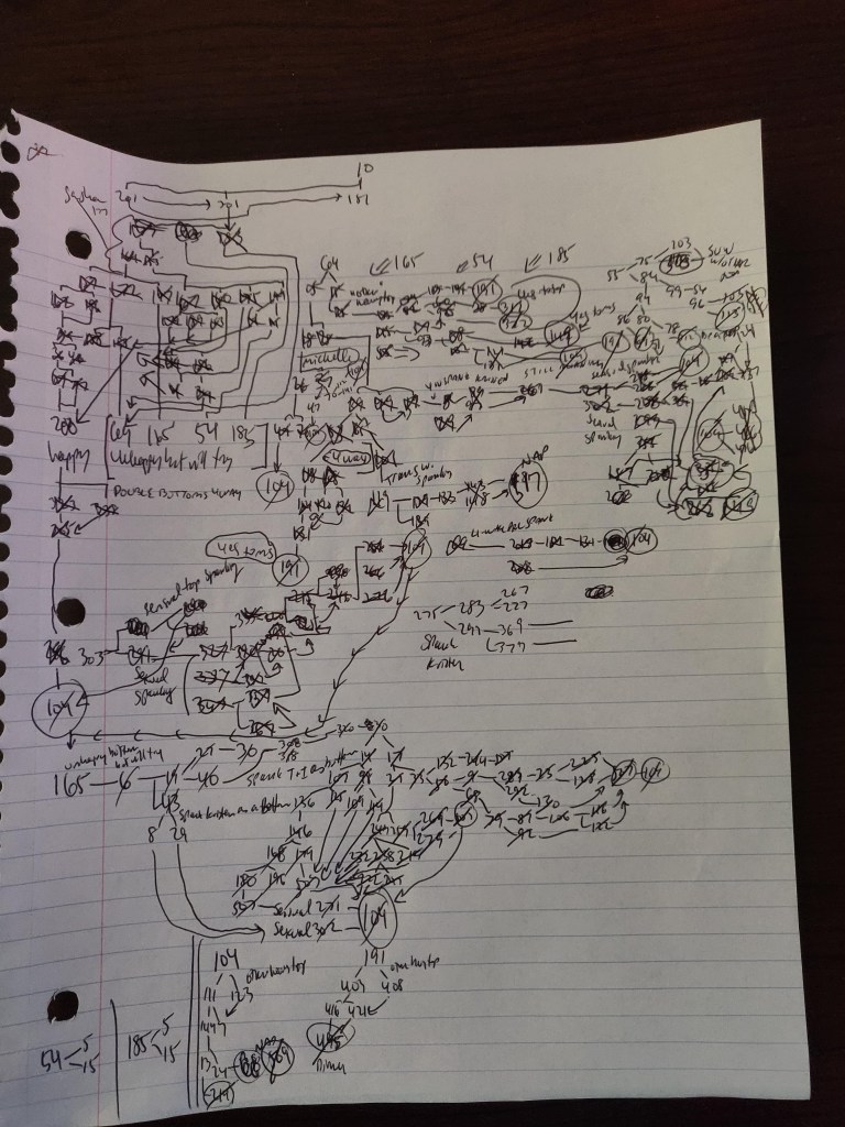 I’ve ordered a roll of paper from Amazon, and I’m going to do one massive flowchart on my desk. That, I think, is the only way I’m going to be able to pull this off.