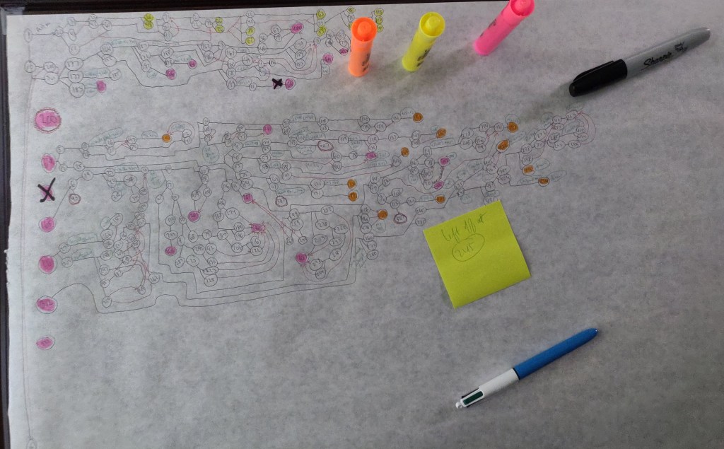 After wiping out six hours of work on my first attempt at doing flowcharts for the sequel to Weekend Plans, I decided to try making a much larger flowchart on a much larger piece of paper.