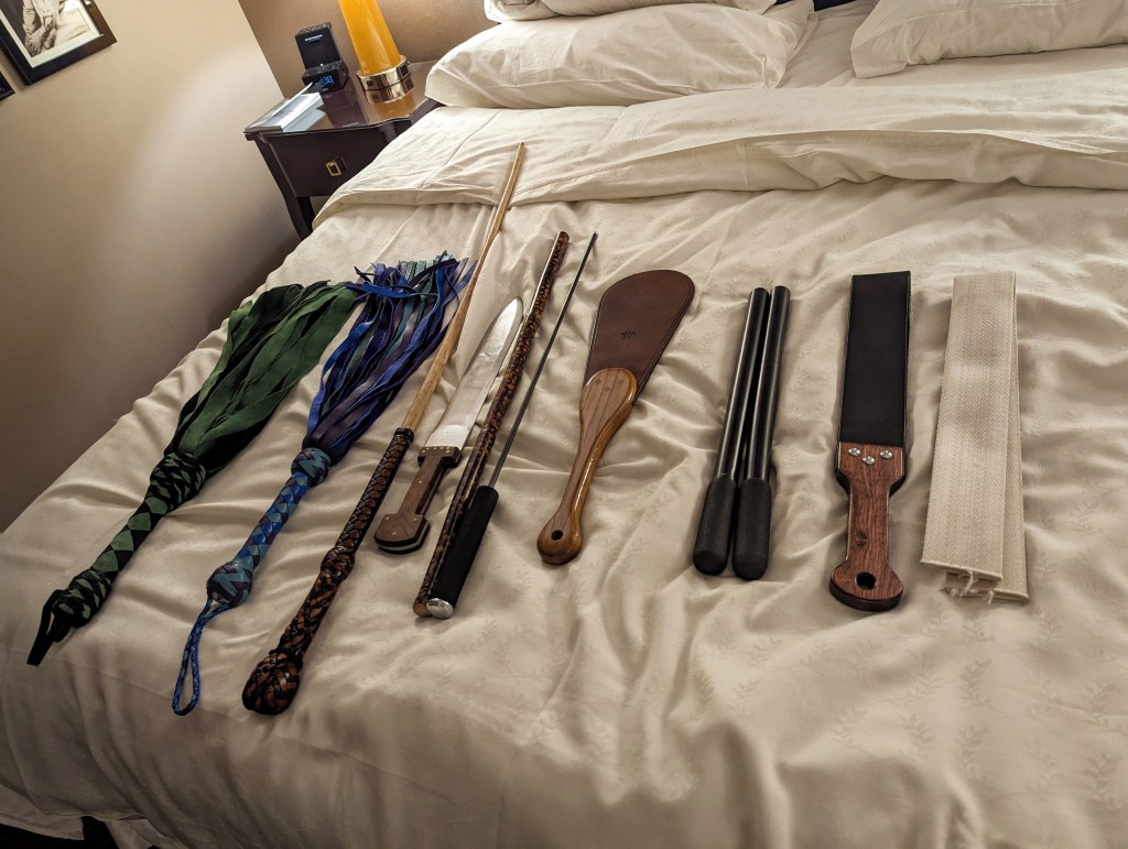 The second person I spanked — and who spanked me — is the man who sometimes goes by Sabina while wearing women’s clothing. You might remember me posting about meeting him at TASSP. We had discussed doing another scene together prior to Lone Star, one in which I too would be spanked, since we didn’t get a chance for me to bottom the last time around. We did this scene in private, and prior to it, we laid out which implements would be used. He has a ton of them, including some very interesting ones that I’ll get to in a bit.