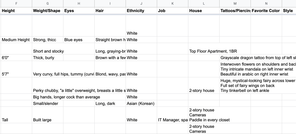 I know there are a lot of different ways to do a character bible. My way is to create a spreadsheet, put characters who usually appear together on rows near each other, and then do columns for various things, such as hair color, eye color, weight and shape, birthdate, relationships, etc. I know there’s software you can use to do this, but I’ve never had much luck with it. I just prefer to keep it all in the same place: my Google drive.