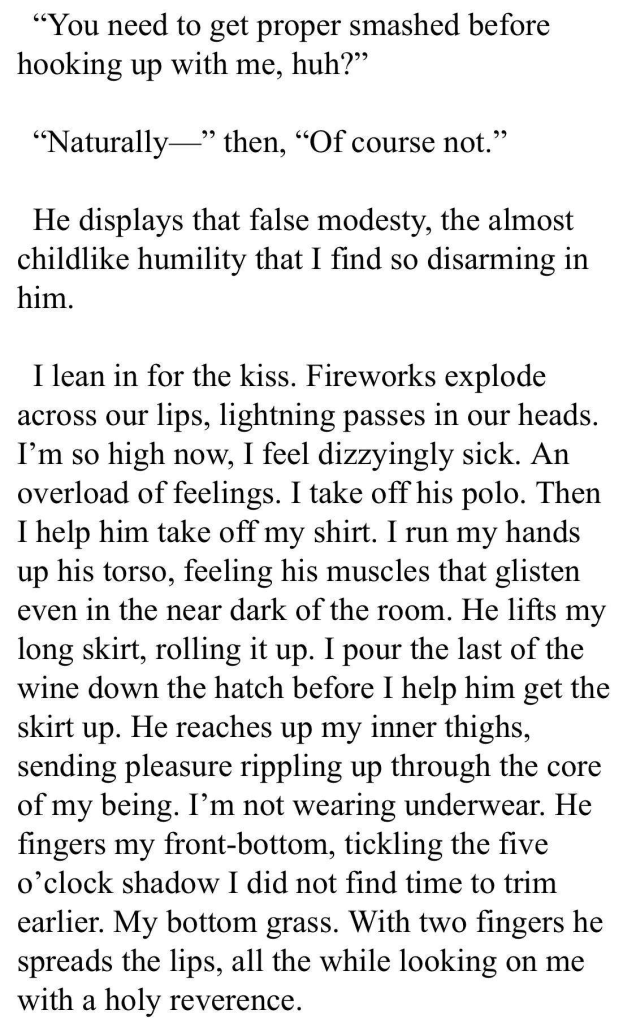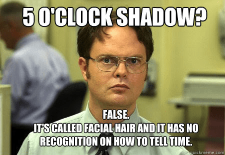 This has to have been written by a dude. I can’t think of a single woman on the planet who would refer to “hair growing back between my legs after shaving” as “five o’clock shadow”.