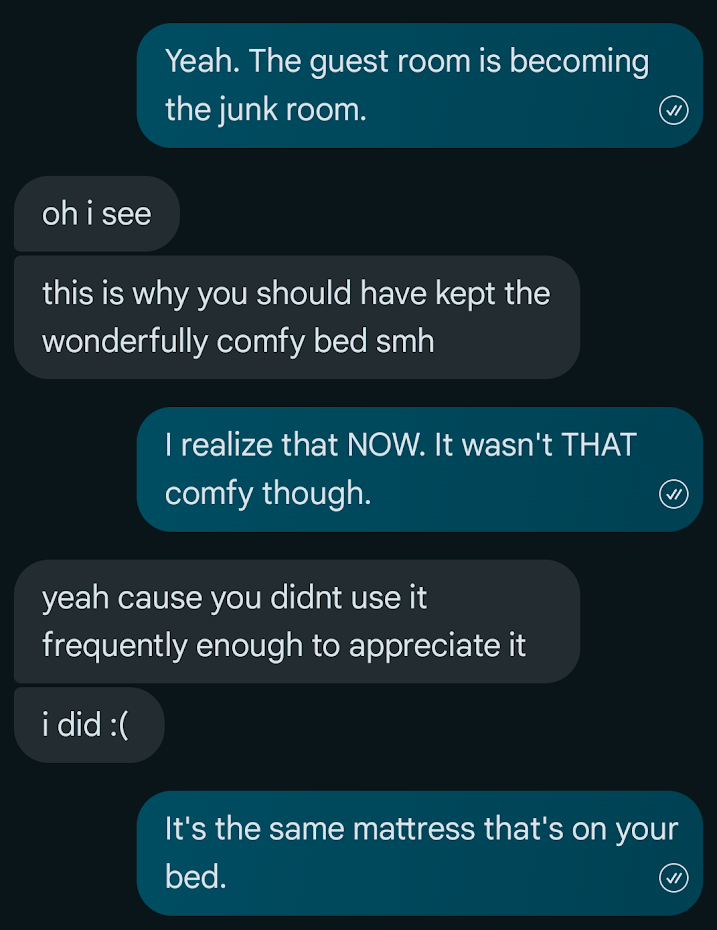 That bed had the same type of mattress my daughter has in her room now, and both beds had a mattress pad. The only real difference is that there’s a TV in the guest room and not one in her room, but since we’re a fully streaming family she can watch everything on her laptop or her computer. Nevertheless, after I got rid of the bed, she got a little indignant.