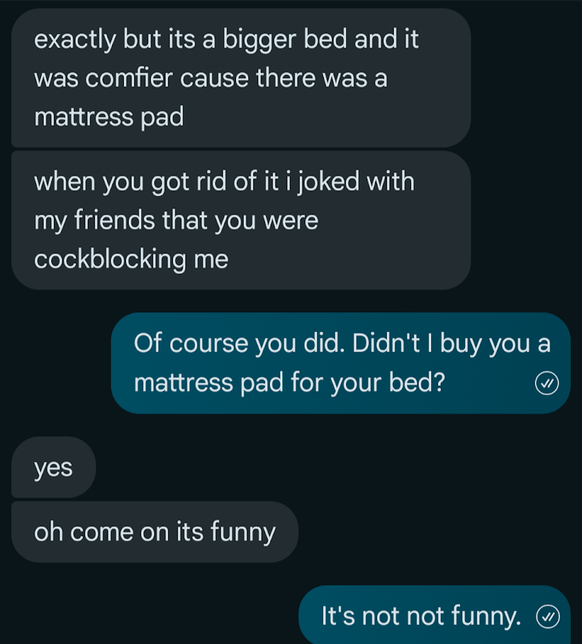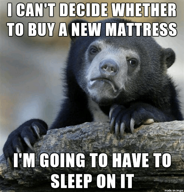 “Wonderfully comfy” was a bit of an overstatement. I’ve slept on that bed before; it was not “wonderfully comfy”. It was “acceptable”. My bed is wonderfully comfy, despite being 12 years old — I think it’s because of the frame that is a platform with a cage pattern, holding the mattress up instead of letting it sink.