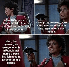 Linguistic drift is the way language changes over time. It’s fascinating. Even in the past twenty-five years we’ve had some of it — the change of the meaning of “literally”, for one thing. So when sci-fi writers write stories that take place in the far future, they have a tendency to make use of this.