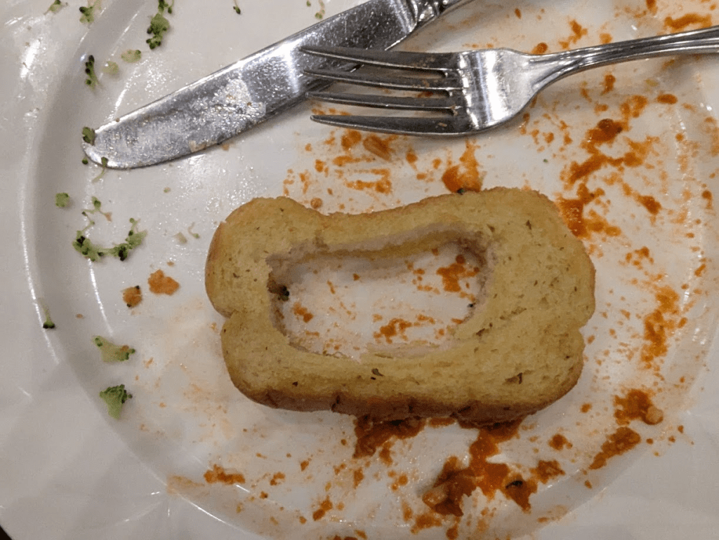 This one takes a bit more explanation. A few holidays ago — can’t remember if it was Thanksgiving or July 4, but I’m leaning toward Thanksgiving — my daughter and I were at my parents’ house and I made a cake in an aluminum pan. I wasn’t feeling like eating the edges, so I cut a piece out of the middle. This absolutely scandalized my daughter, who has still not forgiven me. Well, at dinner on Saturday night I wasn’t in the mood for the crispy edges of the garlic bread, so I cut the middle of it out and ate it, and then texted her a picture. Her response:
