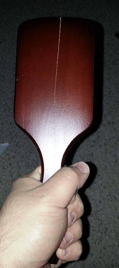 This hairbrush is the first implement I ever broke. It was 2013, and I was spanking the woman who was the inspiration for Princess Eleanora in Lessons. It was our first time together, and the first time I was giving her a “real” spanking (as opposed to a swat when she wandered away in Target or a brief bedtime spanking). This particular woman was known for taking hard spankings, and she wanted discipline in her life. So after warming her up a bit with my hand, I blasted her backside with this hairbrush. Twelve swats later I found a crack in it and we had to stop using it. Sad times. (We switched to a much more robust paddle instead.)