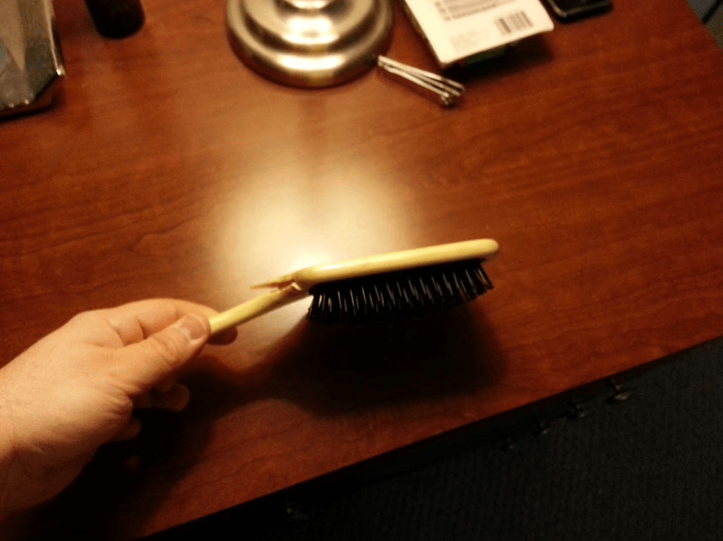 A few months after the first time we met, the woman in the first post of this series joined me in Maryland for another week of spanking adventures. I’d put in an order to Rite Aid for some items I needed, and I decided to pick up this hairbrush, which I destroyed in fewer than ten swats. It just went crunch. Needless to say, I never bought another hairbrush from them.