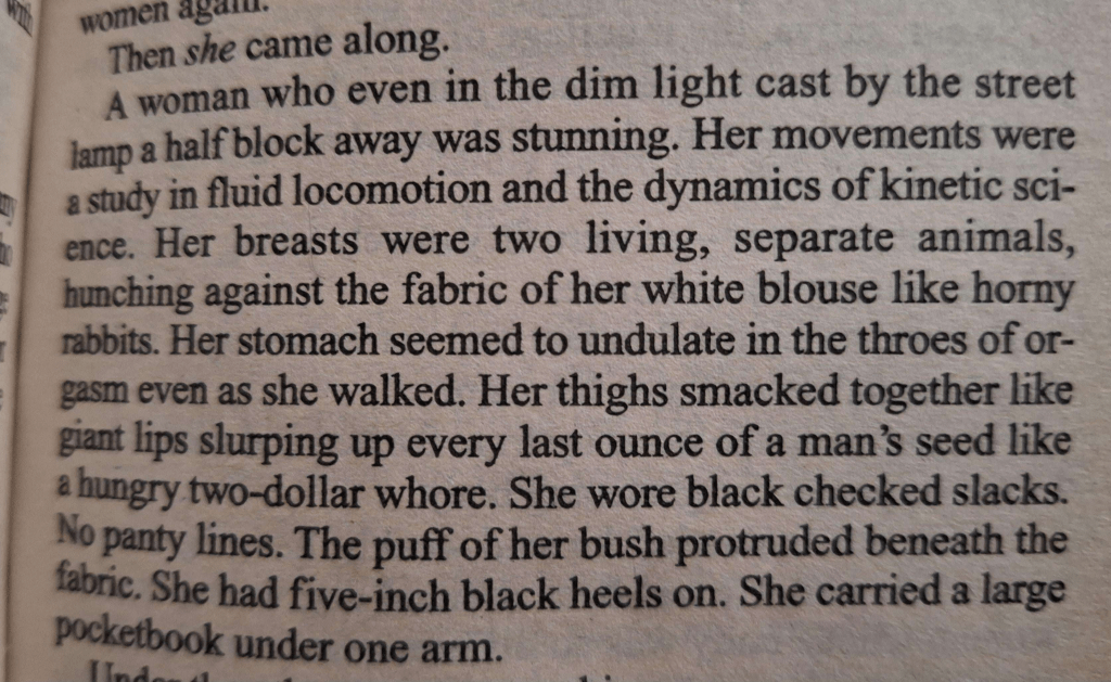 Like… where do I even begin? What does this woman look like? Is this the author’s way of trying to tell us she’s curvy? How tall is she? Why is she wearing five-inch heels? How can the POV character see the lack of panty lines from half a block away? I mean, sure, I look for women’s panty lines sometimes too, but I usually have to be within ten or so feet to really get a read on what kind of panties she’s wearing (or not). And by the way it’s hard to tell panty lines in black checked slacks — solid colors are better for that.