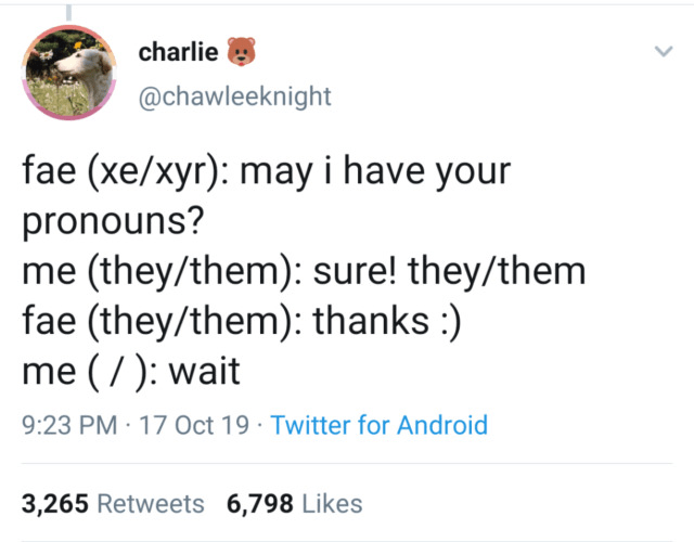 Keep in mind the fight that neopronoun users are still going through for their (for lack of a better term) visibility and acceptance. It’s gotten worse for them, not better. So don’t take something they fought so hard for and intentionally misuse it to increase your potential engagement.