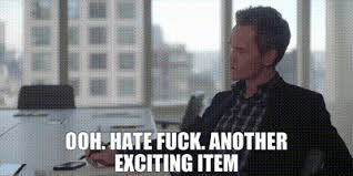 I’ve had a nonzero number of sex partners in my life, and I’ve never once fucked one of them like I don’t at the very least like them. I can’t imagine having sex with someone I don’t like — hatefucking is not something that I’m particularly interested in. I can fuck someone with the same intensity that one might use during hatefucking without actually hating them. Hell, even when I was married the first time and we were getting to the point where I despised her I still never hatefucked her.