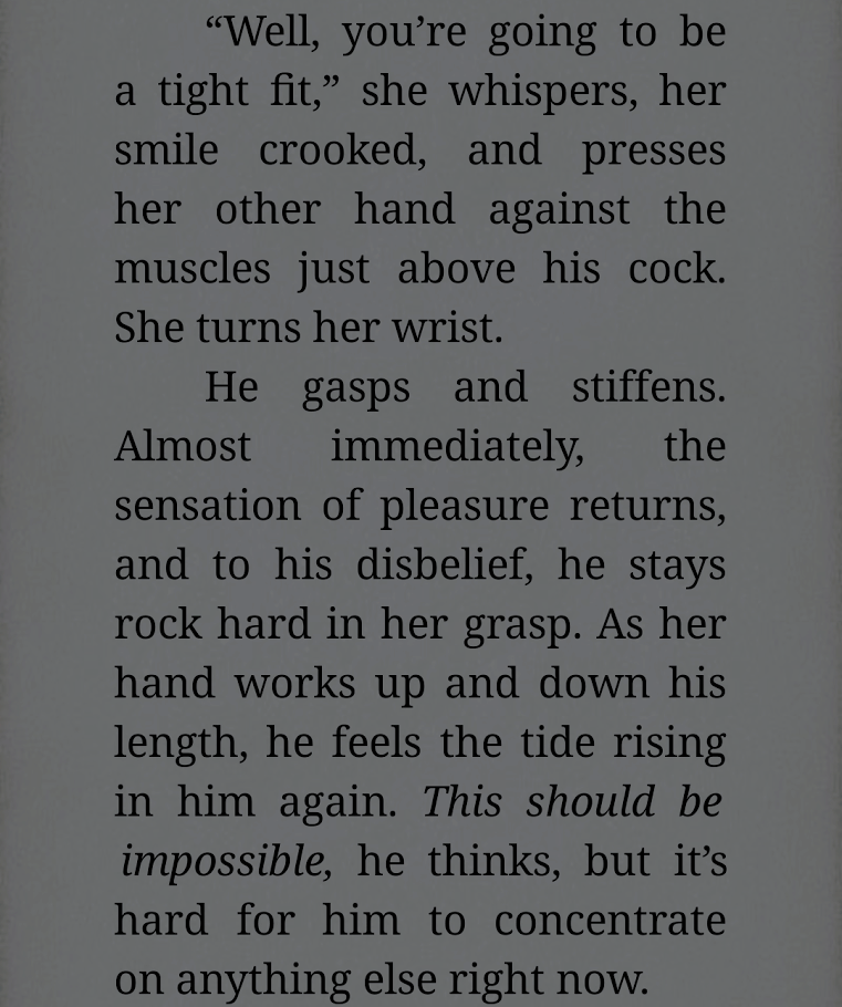 I would also like to point out that the characters in the snippets above don’t use protection. The woman knows that the man is a virgin so the odds of him having a STI are small, but she is clearly experienced which suggests that she has had sex at least once before (probably plenty of times, though). The man doesn’t even think about these things, or about possibly getting her pregnant. I realize that bringing it up would just break the flow, but I can think of at least three good ways to mention it. The man is very anxiety-ridden and shy; he probably is worried about STIs or pregnancy. He could bring it up and wilt, and she could bring him back to full hardness while telling him she can’t get pregnant because of some magical reason or another.