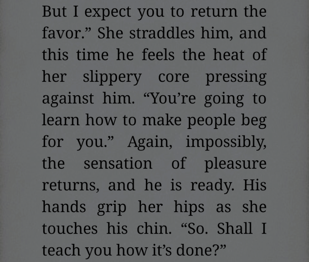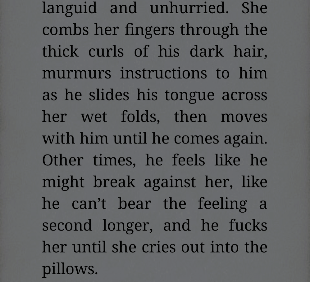 Overall the sex scene is pretty good, but why is it that authors (especially female authors) tend to refer to a woman’s genitals as a “core”, or that she has “folds”? Look, I get it; there aren’t a lot of pretty-sounding words for female genitalia. I mean, except in some older stories/books of mine I generally talk around female genitalia. “Vulva” and “vagina” sound clinical, “pussy” is silly-looking, “cunt” is considered one of the rudest words in American English, and if you follow Katelyn Brawn on Instagram you’ve heard plenty of truly ridiculous ones beyond that. There just isn’t a good word that authors can use, so they resort to “core”. I mean, even Jacqueline Carey uses the term “nether lips” multiple times in the Kushiel series, as well as “phallus” to refer to the penis, but she makes it work.