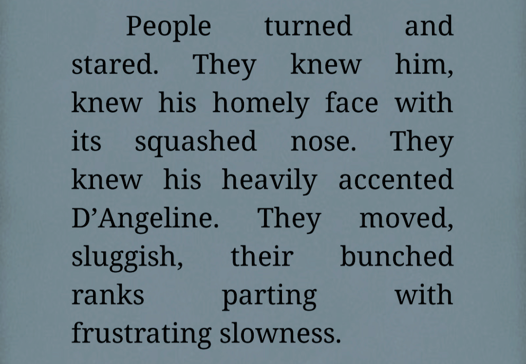 I know what Carey is trying to do: she wants us to remember that Kratos is not beautiful like the D’Angelines — or even many of the others in the book who are not D’Angeline. But if you think about it, you probably have acquaintances (maybe co-workers) who you see regularly who also are not beautiful. Some might even be considered homely. My question is: do you think of them first and foremost as being unattractive? Of course you don’t. You might think that the first or second time you meet them, but would you describe them that way if asked? Of course not, because it would be rude. I have friends who some might consider unattractive, but I don’t refer to them that way in my writing or in my head.